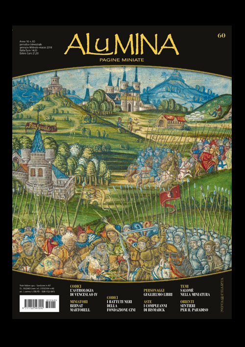 Fra questi, di Alessandro Martoni, I piaceri del martirio dedicato a un codice miniato della Fondazione Cini di Venezia che illustra le diuturne meditazioni sulla sofferenza e le dolorose pratiche penitenziali dei seguaci della Venerabile Confraternita della Morte di Ferrara, noti come “Battuti Neri”. In Tanti auguri, cancelliere, Gianfranco Malafarina racconta con la consueta verve, i messaggi augurali variamente miniati, inviati a Otto von Bismarck dai suoi connazionali nelle varie annuali occasioni del suo compleanno (1 aprile), anche quando esonerato dall’incarico di I Kanzler dell’Impero di Germania, battuti alla recente asta autunnale da Reiss & Sohn a Königstein. La figura di Salomè è invece messa sotto la lente d’ingrandimento da Tito Saffioti in La danza fatale che ripercorre l’iconografia di questa celebre principessa giudaica. Segnaliamo inoltre nel sommario: Figli delle stelle di Ulrike Bauer-Eberhardt, Artista e imprenditore di Josefina Planas, Un nome, un destino di Daniele Guernelli, Sentieri per il Paradiso di Bryan C. Keene e Morgan Conger.